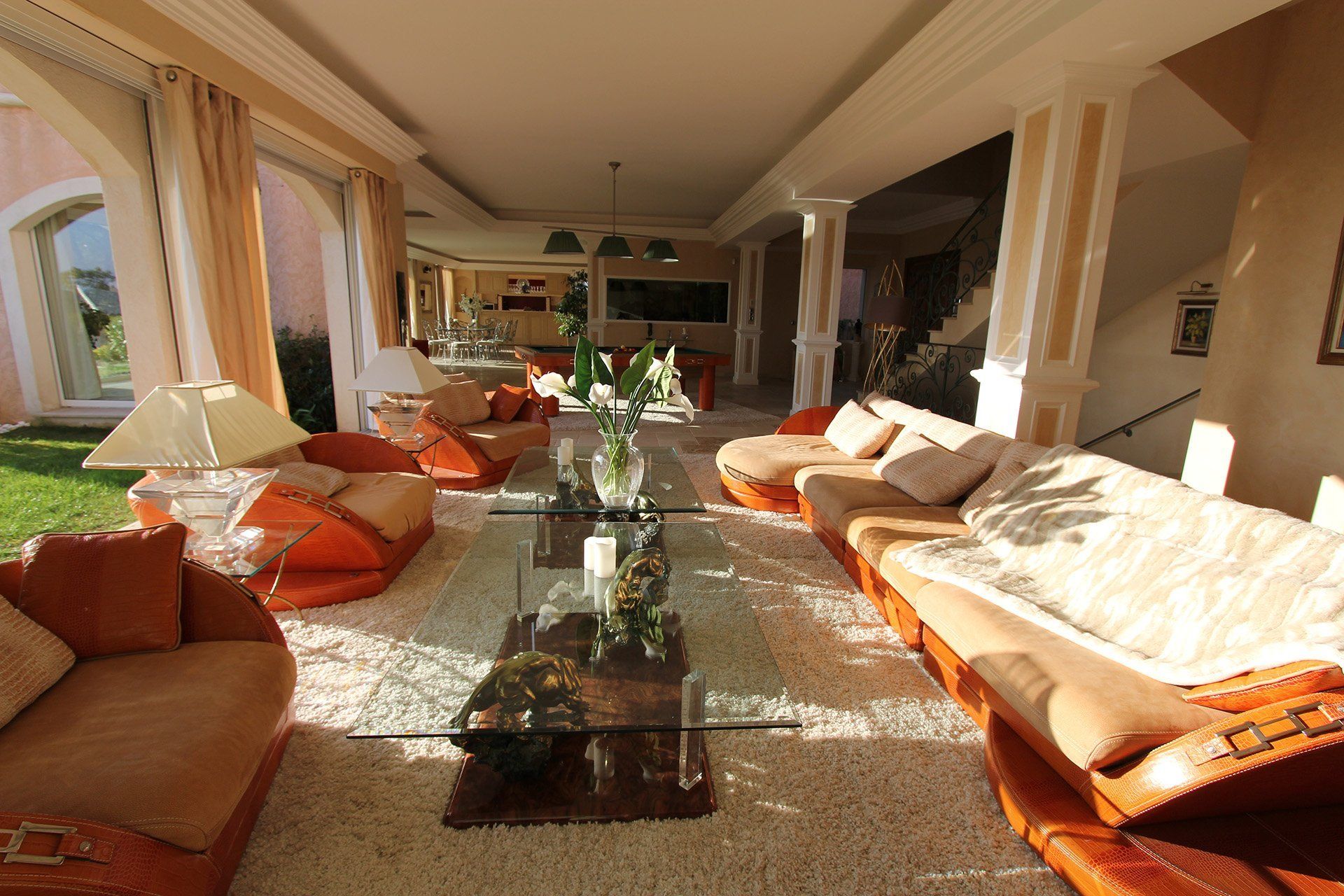 A spacious living room with a fireplace, a bar, a pool table, sofas, armchairs, a piano and a large dining table has several exits to the garden and to the pool. Plasma TV, satellite TV.
